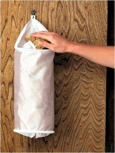 Recycle and re-use your plastic grocery bags without having them clutter your cabinets. This amazing bag dispenser stores and easily dispenses your plastic bags. Stuff the bags into the top and pull one bag at a time from the bottom. You can use it anywhere throughout your home, in the kitchen, garage, campers or boats even. And there are two ways of hanging it! Either from a doorknob or on the hook included. Simply attach the metal hook to a door or wall, line up the holes by folding the hook and loop strap in half and place it on the hook. Save your shopping bags to use as trash or waste bags, lunch bags or for general purposes. .
